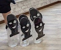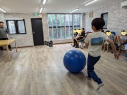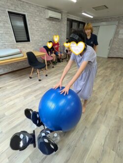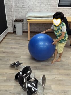 ペットボトルに悪者の顔を貼付け、バランスボールで顔を目掛けて!!