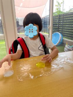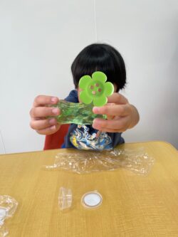 スライム遊びではみんな、スライム独特の触感や、変幻自在に伸びたり広がったりする様子を楽しんでいました。