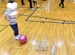 ボールをペットボトルのピンを倒します(>_<)