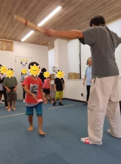 障害物役としてスタッフが両手を広げ、上下に動かします。