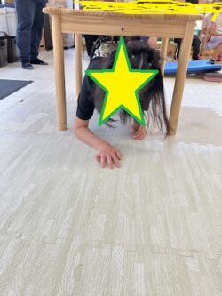 最後は小さいテーブルの下をくぐり抜けてからボールをカゴに入れてゴールです。