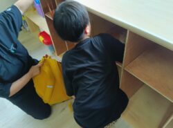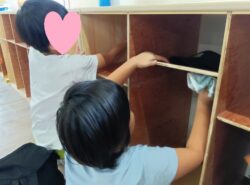 まずは毎日使っているカバンを入れる棚を雑巾で拭きます。