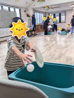 紙皿の上にボールを乗せ、ボールを箱の中に入れて、次の子にバトンタッチ✋