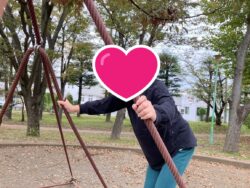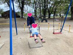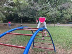 公園のアーチてつぼうやブランコなどの遊具があるなか、
