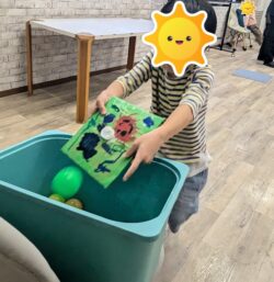 本日の課題は「感覚遊び」ということで、「ボール運びリレー」を行いました。