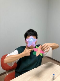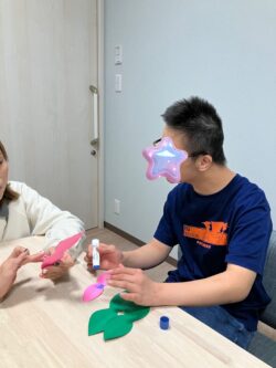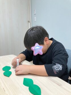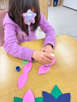 はなびらと葉っぱを交互に重ね合わせてのりで貼り付ける作業でした!!