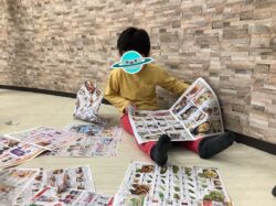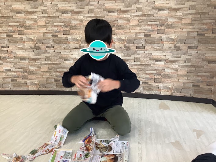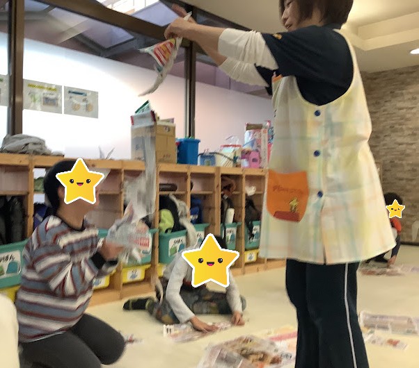 スタッフやお友だちが紙を破る行為を見て、マネっこをしたり、破いたり、時には丸めたりといった