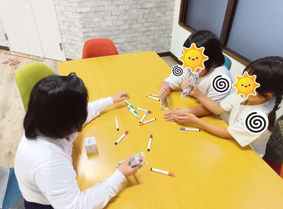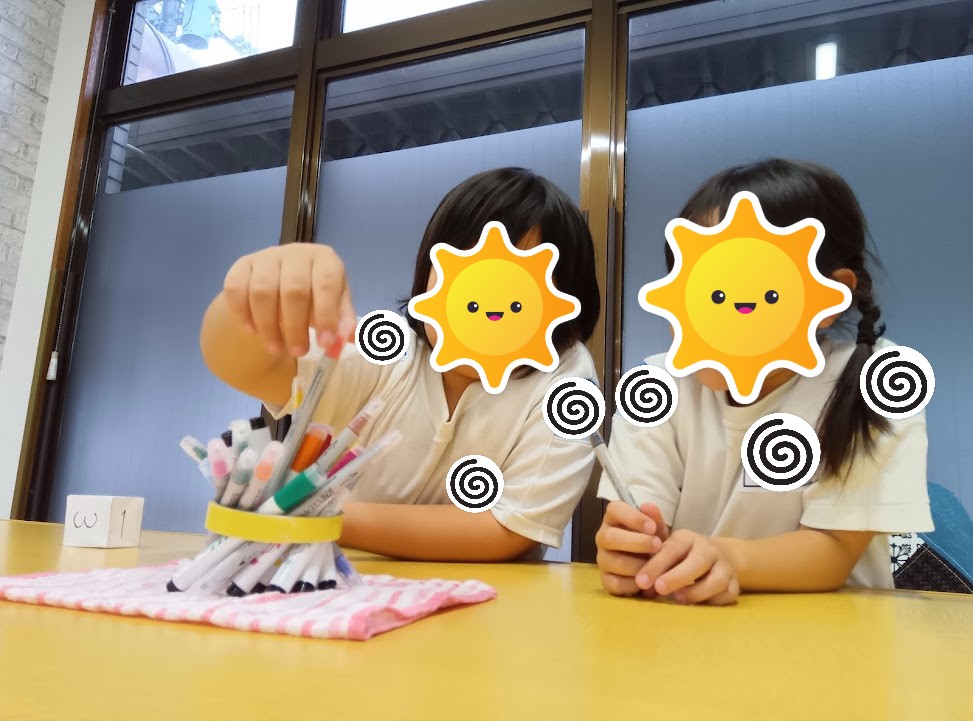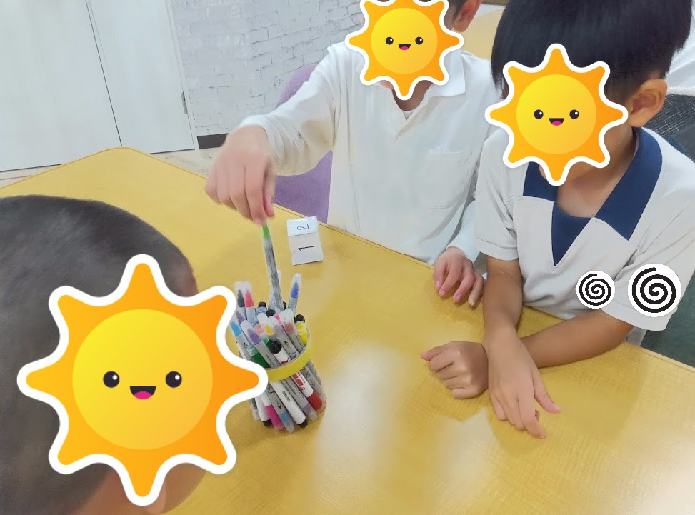 ペンでできた柱を崩さないよう、サイコロを振り出た目の本数分一本ずつ抜き取ってもらいました。