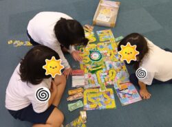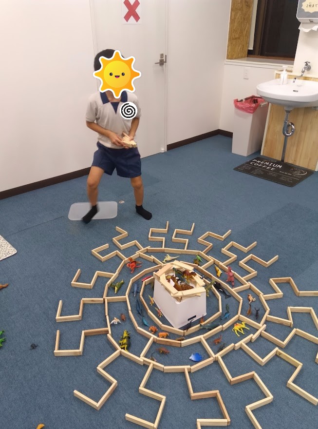 自由時間は人生ゲームをしたり、積み木を使って太陽をモチーフにした恐竜のアジトの大作を作りました😆