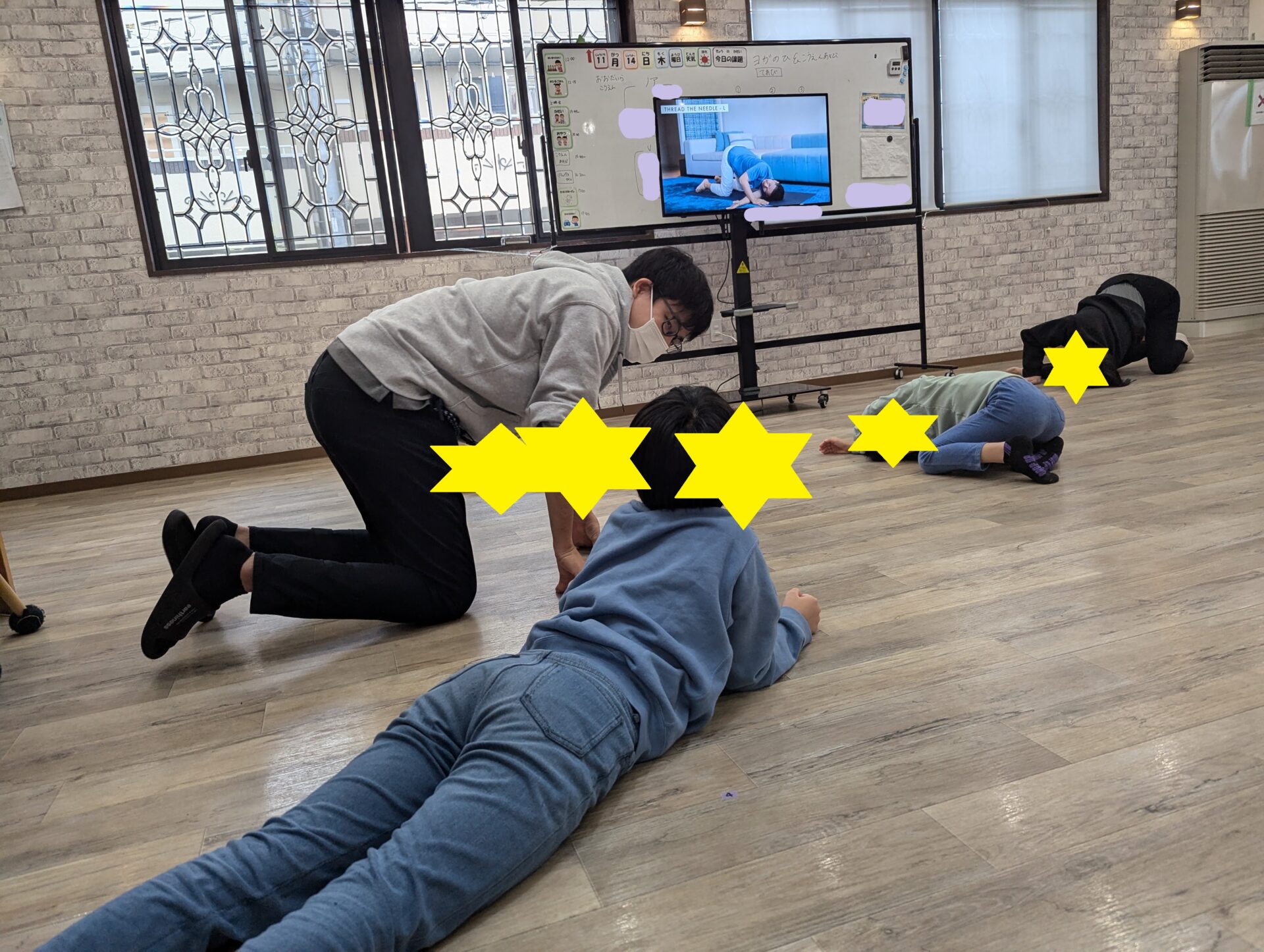 ヨガは、動画を見ながらスタッフのお手本を見て真似をします。