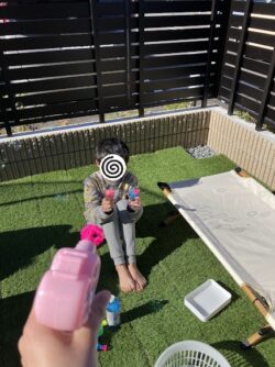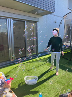 午前中は、トランポリンやシャボン玉をしたね!