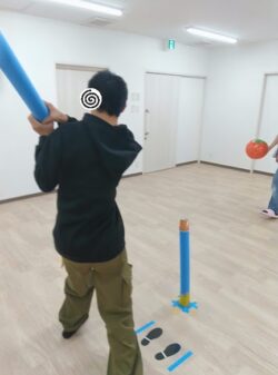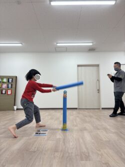 ①バッティングは、プールスティックを使ってTボール形式で1人三回ずつボールを打つ