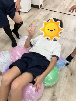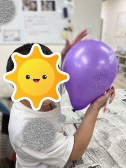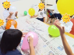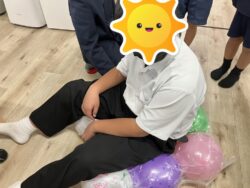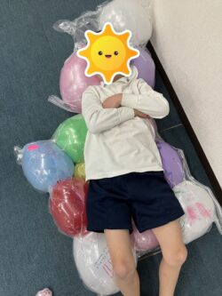 風船に絵を描いてもらい、圧縮袋に入れます。それを掃除機で吸込み真空状態にしてベッドにします✨