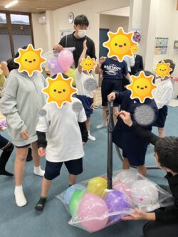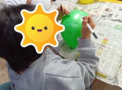 絵を描いた風船を圧縮袋に入れていきます。掃除機で吸い込みましょう!