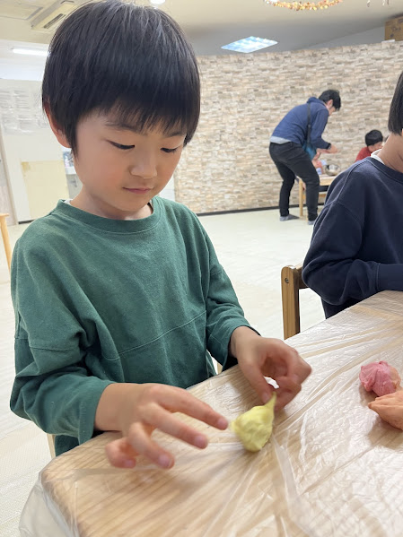 本日は「感覚遊び」の日、小麦粉を水で練って食紅でピンク、きいろ、オレンジと三色を付けた粘土で遊びました🌞