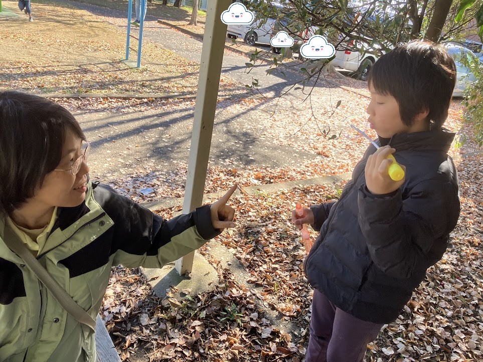 滑り台をやってみたり、ブランコや、シーソーで遊んだり、シャボン玉をしたり