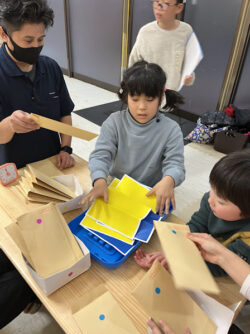②集まったその封筒を、色ごと(赤、黄、青)に仕分けします。
