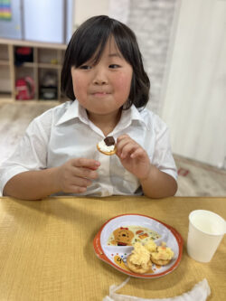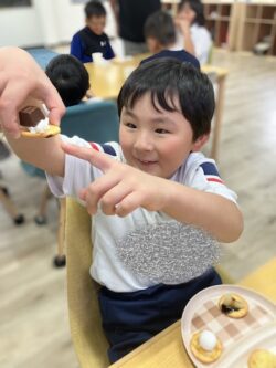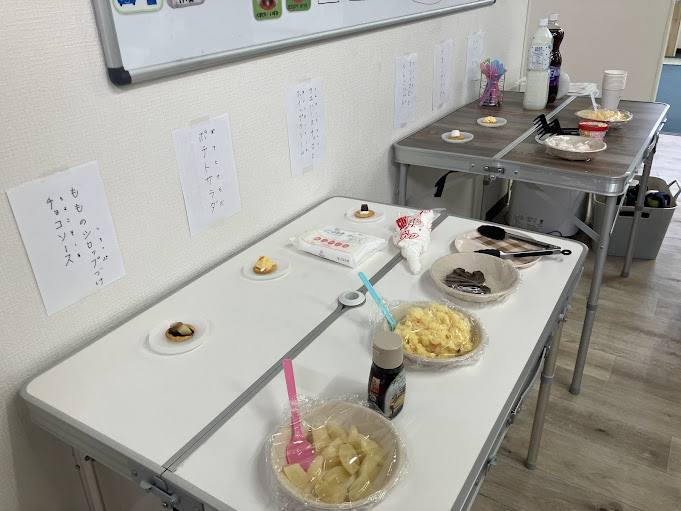 桃のシロップ漬けチョコソース、ポテトサラダ、ウエハースチョコとホイップクリーム、マシュマロとリンゴジャム、たまごサラダの5つのトッピングを用意しました🍳