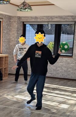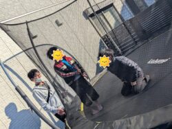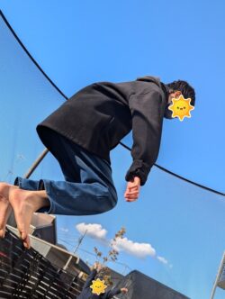 お昼ご飯を食べた後、まはろ桜にある大きなトランポリンを使って運動をしました。
