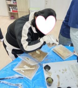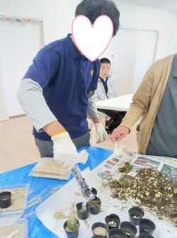 サボテンの植え替えグループは育ったサボテンの苗を別の鉢植えに入れ替えます。