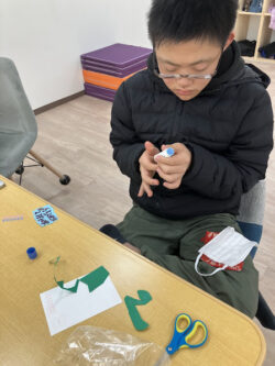 色紙に絵が描かれたヘビをハサミで上手に切ったり✂
