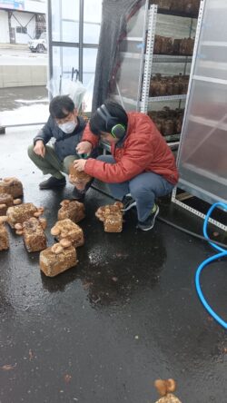 しいたけのお世話では、スタッフの話をよく聞いて収穫したり菌床のカビ取りを