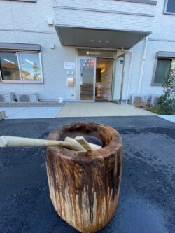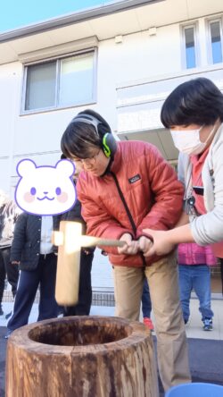 青空の下で、全員でそれぞれ2巡、お餅をつきました☻