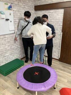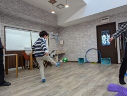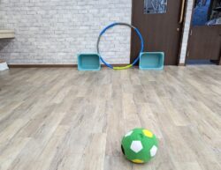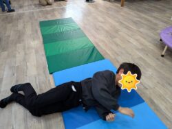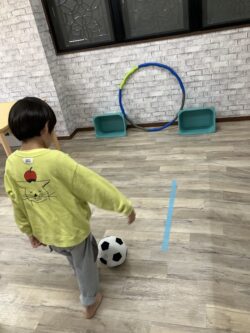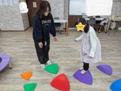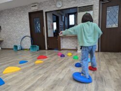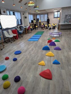 本日のコースは、①マットの上えんぴつゴロゴロ ②トゲトゲ飛び石ぐらぐらバランス ③離れ小山渡り ④ぴょんぴょんトランポリン ⑤手・足を使って的当てゲーム