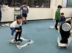 まず新聞紙を輪っかを破らないように潜り抜けるゲームをしましたが・・・