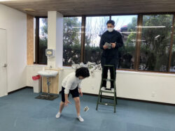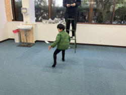 二つ目のゲームは落ちてくる新聞紙の切れ端を両手でキャッチ👏