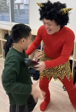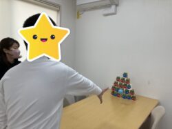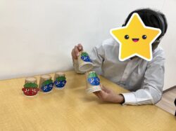 豆まきをヒントに、鬼の画像を貼った紙コップを並べて、