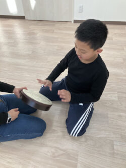先生の太鼓のリズムに合わせて叩いてみよう!