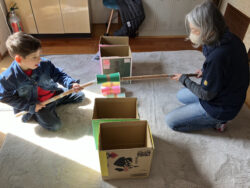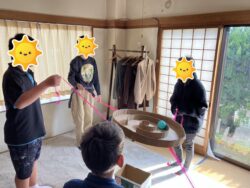 こちらはスタッフさんと協力して、新聞紙で作った棒を使って色分けした紙コップを、同じ色分けした箱の中に入れていきました😊