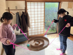 みんなで声を掛け合いながら、ゴールの穴までうまくボールを誘導して落とします😊