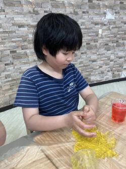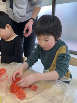 感覚遊びは五感を刺激する遊びで、脳の発達や情緒の安定などをねらいとしています。