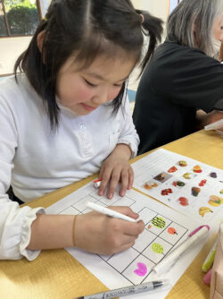 自分たちでビンゴ表に好きな果物の名前を書いてビンゴシートを完成させたのですが、言葉で書く子や英語、イラスト等それぞれ自分たちのアイデアでオリジナルシートの完成✌