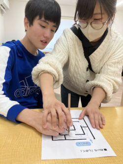 ⑤協力ゲームでは、2チームに分かれてリレー形式で課題に取り組んでいきます。