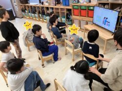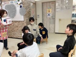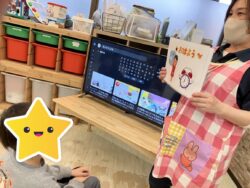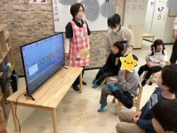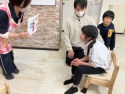 それからスタッフが実際に絵カードを見せて、皆さんで一緒にあいさつの練習をします!