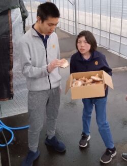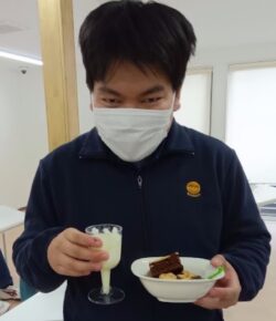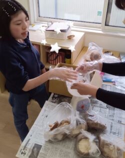 気持ち良くルーティンのラジオ体操・ストレッチを行い午前はホワイトデーのおやつ作り💓班と椎茸収穫班とに分かれて活動。