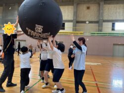 グループで協力して大きいボールを運んでいます💦