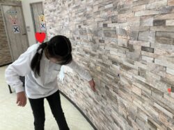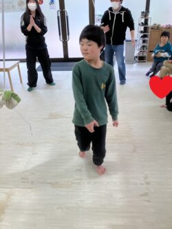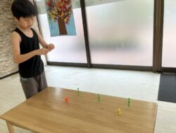 跳んだ後は、壁に貼ってある色々な色のシールを一つずつタッチし…