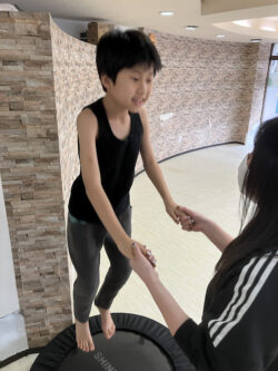 まずはスタッフの目を見ながらトランポリンを20回跳びます!
