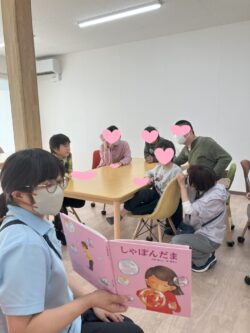 ①読み聞かせでは、「しゃぼんだま」の絵本を読みました。