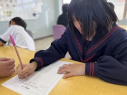バイキングでの悪いマナーをみんなで話し合って紙に書いています!