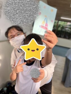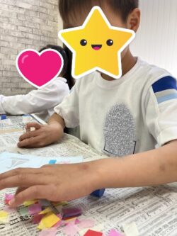 型抜きした色画用紙にトレーシングペーパーを貼って、はな紙を貼り付けて二つ折りにしたステントグラス風しおり作りを行いました☺