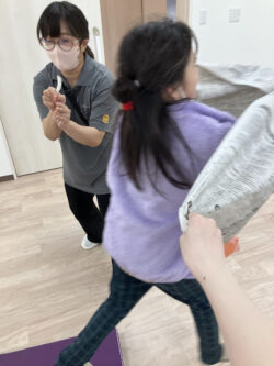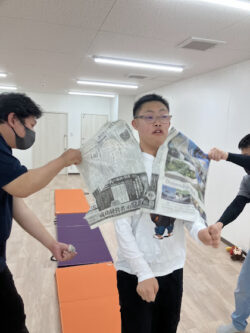 新聞紙体当たりは始め少し怖がる子もいましたが、自分の番が来ると皆笑顔で取り組んでくれたのが嬉しかったです😊