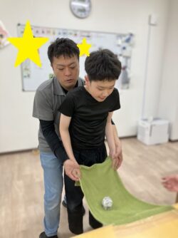 今日はタオルにボールを乗せて紙皿に向かって飛ばします💫