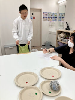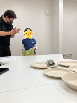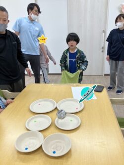 あっという間にコツをつかむと遠い紙皿にも上手に入れていきます😊