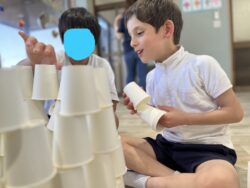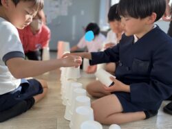 2グループに分かれ、準備された紙コップを使って遊びました。