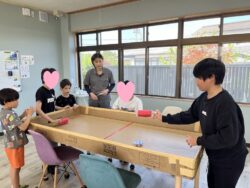 午前中は、スタッフ力作の段ボールで作ったエアホッケーで遊んだり、折り紙遊び等を楽しみました。